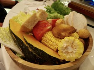 Sie servierten uns in unsäglichen Mengen Gemüse, Fleisch und Fisch sowie Nudeln und Reis. Dies wird in eine Art Bouillon reingeworfen und wenn es gar ist wieder rausgefischt.
